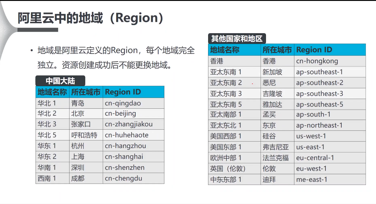 地域是阿里云定义的Region,每个地域完全独立。资源创建成功后不能更换地域。