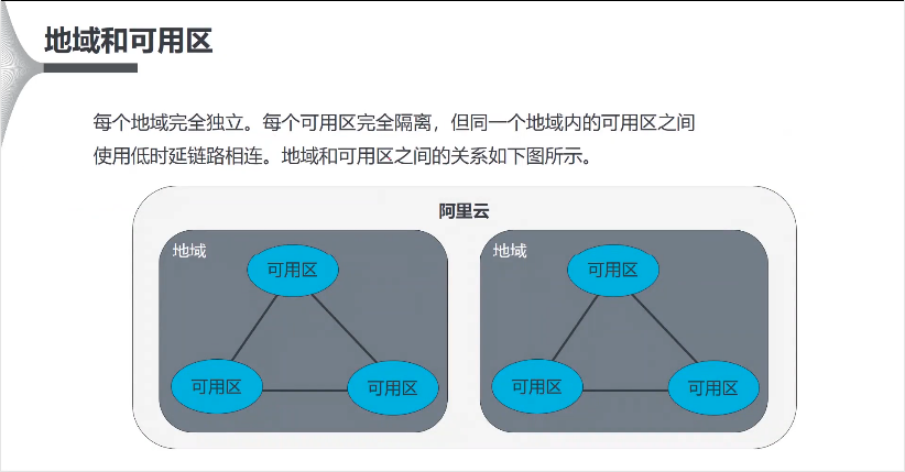 每个地域完全独立。每个可用区完全隔离,但同一个地域内的可用区之间使用低延时链路相连。