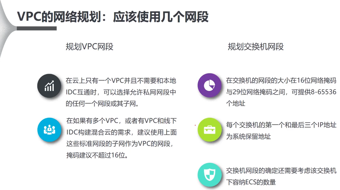 阿里云VPC提供了192.168.0.0/16,172.16.0.0/12,10.0.0.0/8以及它们的子网供用户选择使用。
