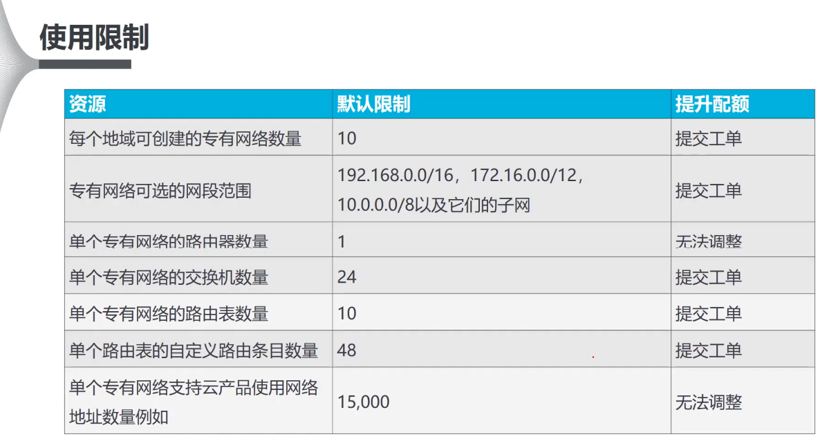 网络:专有网络(Virtual Private Cloud):逻辑上彻底隔离的云上私有网络。可以自行分配私网IP地址范围、配置路由表和网关等。