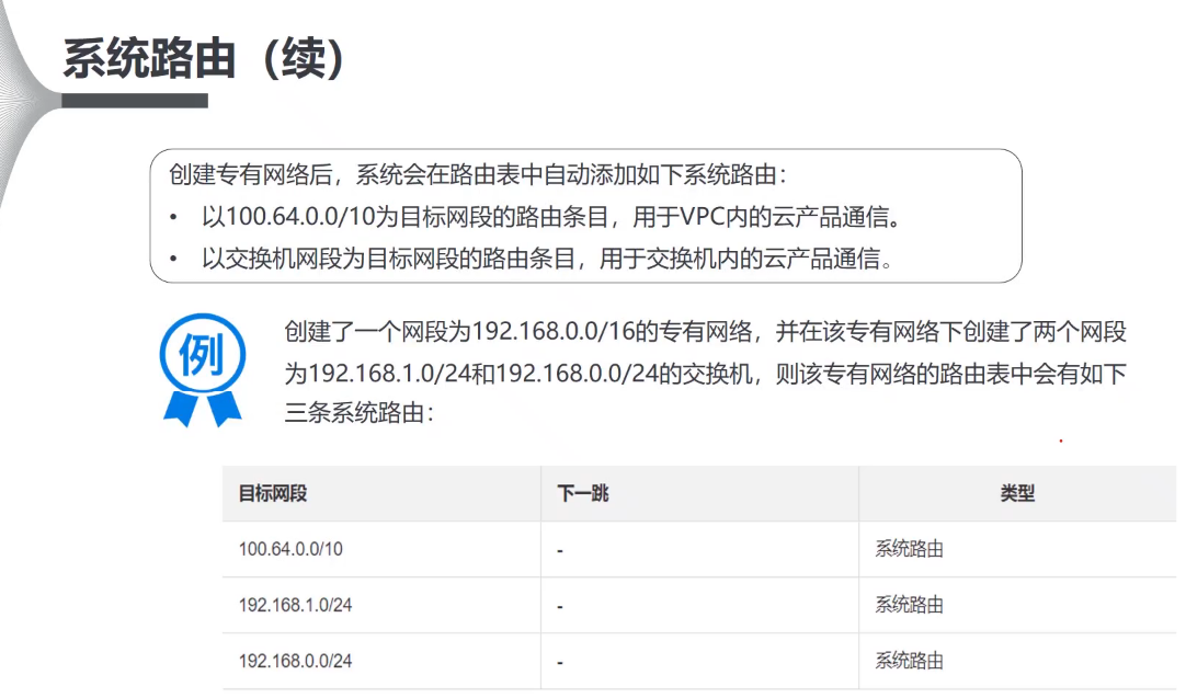 创建专有网络后,系统会自动为用户创建一张默认路由表并为其添加系统路由来管理专有网络的流量。一个VPC只有一张系统路由表。该系统路由表在创建VPC的时候自动为用户创建,用户不能手动创建也不能删除默认系统路由表。
