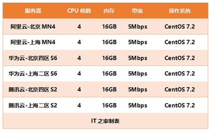 为了保证数据的准确性,我们测试时选取了各家厂商北京和上海两个机房的服务器进行对比测试,同时测试过程中所使用的陪练机也均为与测试机同类型的1核1GB内存,带宽为5Mbps,CentOS 7.2操作系统。