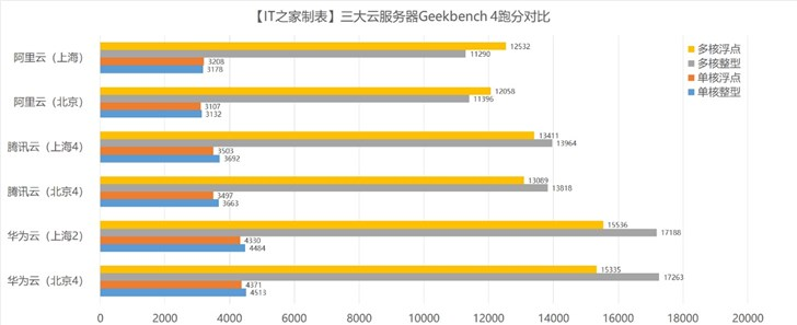 这三款服务器中,腾讯云的具体型号我们无法知晓,但是通过Geekbench 4跑分数据来看,应该是至强E5 269x v4。由于华为云S6采用的架构比较新,所以华为云S6单核和多核跑分明显好于腾讯云S2和阿里云MN4。