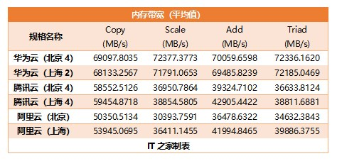 这里我们看到,华为云S6服务器内存规格相比于其他两家更好,这样它的stream内存测试数据也是最好的,腾讯云S2服务器次之,阿里云MN4北京和阿里云MN4上海采用的内存规格显然并不一样,这就出现带宽表现差距比较大的情况。