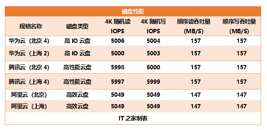 各家虽然命名不同,但是基本的磁盘命名方式我们也能大体了解这些硬盘的一个能力如何,华为云将高速硬盘命名高IO云盘,腾讯云将其命名为高性能云盘,阿里云则称之为高效云盘,这里我们首先来看一下各家高速云盘的表现。