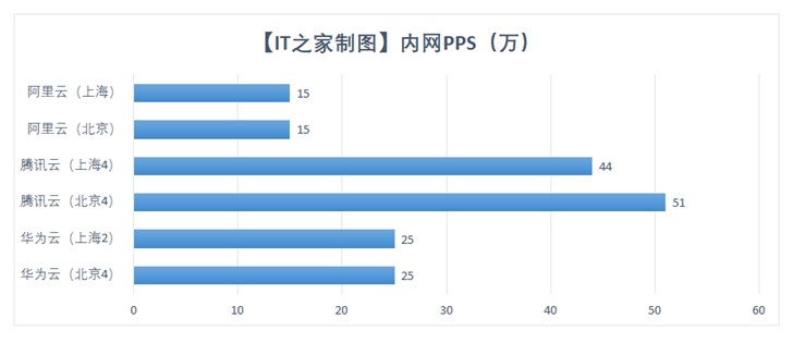 通过测试结果我们看到,华为云S6内网PPS为25万,腾讯云S2内网PPS在45万至51万之间,阿里云MN4内网PPS为15万。整体来看,腾讯云内网数据表现更好一些,不过其他两家的表现也基本上能满足企业用户日常的使用需要。