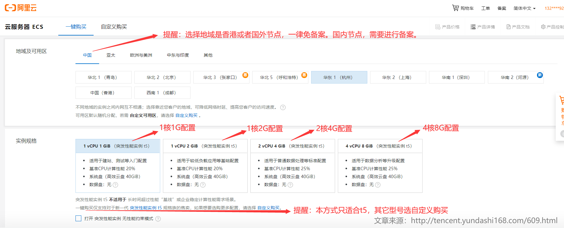 这种方式就是传统的阿里云官网购买方式。特别提醒:本方式只能选择突发性能T5型号,有不了解该型号特点的,可以参考帮助使用文档来了解它的特点。