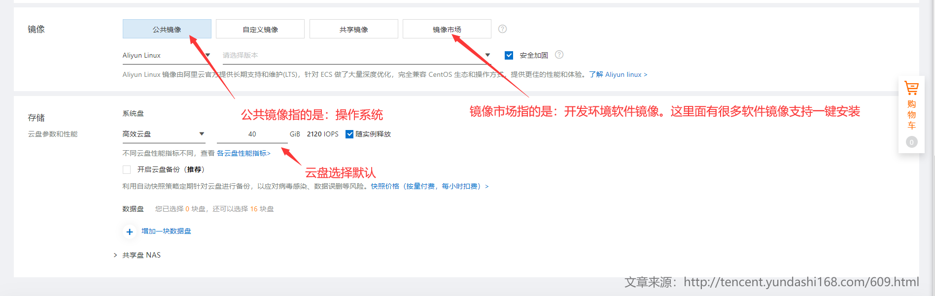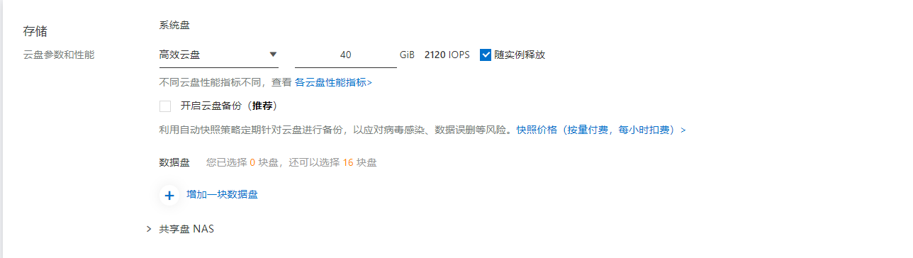 - (3)、系统盘默认就可以了,如果想要系统性能好点,可以选择 SSD 类型的系统盘。存储(云盘)选择默认就好,就选40GB