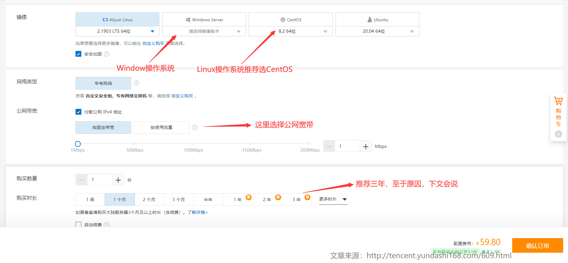 推荐三年,原因是阿里云针对新用户有折扣,老用户就没办法享受,所以如果你的账号是新账号的话,建议不要你的账号去选择1个月或者1年的,尽量时间选择长一点。(等你不是新用户的时候,你就发现阿里云同等配置的服务器要贵蛮多) 以后续费:建议找家人和朋友的新账号购买。你只需要做好服务器之间程序和数据的稳定迁移就可以了。