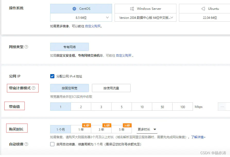 选择云服务器的地域、实例规格、镜像、公网带宽、购买数量和购买时长: