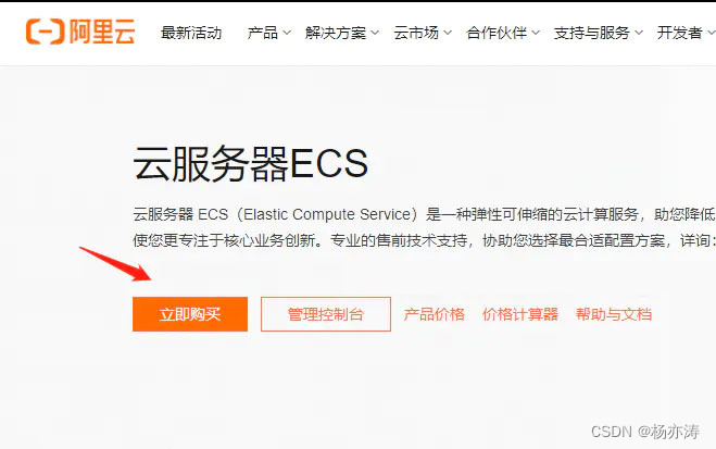 1.3、购买流程如下(图文教程): 第一步、打开阿里云官网,并登录我们阿里云账号之后,进入云服务器ECS产品页https://www.aliyun.com/product/ecs,点击立即购买: