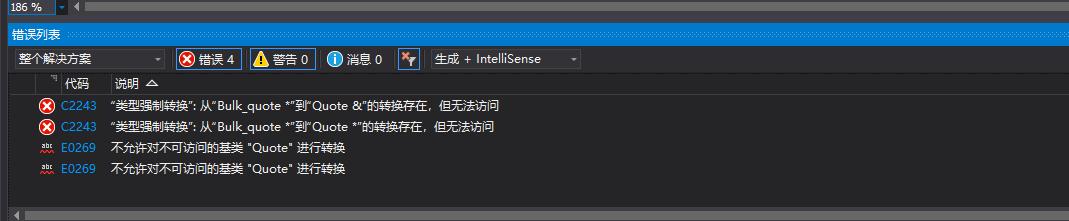 - 因为 Disc_quote 类中 定义了一个接受四个参数的构造函数, 表明 Disc_quote 类编译器不会为其合成的默认构造函数。 但我们创建 " Bulk_quote myBulk_quote " 这样的对象时, Bulk_quote 类的 默认构造函数 会调用 Disc_quote 类中的默认构造函数, 如果该类中没有, 因为Disc_quote 类中有其他的构造函数,表示不会再生产合成版本, 说明合成的默认构造函数是 不可访问或已删除的,那么 Bulk_quote 类就不能通过其基类 初始化 Bulk_quote 类的基类部分。