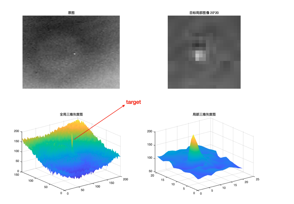在阅读文献时,经常可以看到目标的三维灰度图,作者通过展示目标增强前与增强后,或背景抑制前和抑制后的三维灰度图来直观地向读者呈现其算法的效果。
