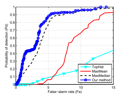 弱小目标检测中的ROC曲线,以虚警率(false-rate, FA)为横轴,以检测率(Probability of detection, PD)为纵轴(FA,PD的定义见第一部分)。