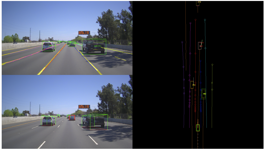 图 2: Apollo 3.0中感知输出的可视化。左上角是基于图像的输出。左下角显示了对象的3D边界框。右图显示了车道线和物体的三维俯视图。CIPV标有红色边框。黄线表示每辆车的轨迹
