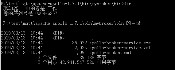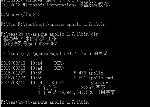 cmd,然后进刚刚放文件的目录,dir一下,你其实指可以看到apollo跟apollp.cmd文件,那个mybroker是我运行建的。