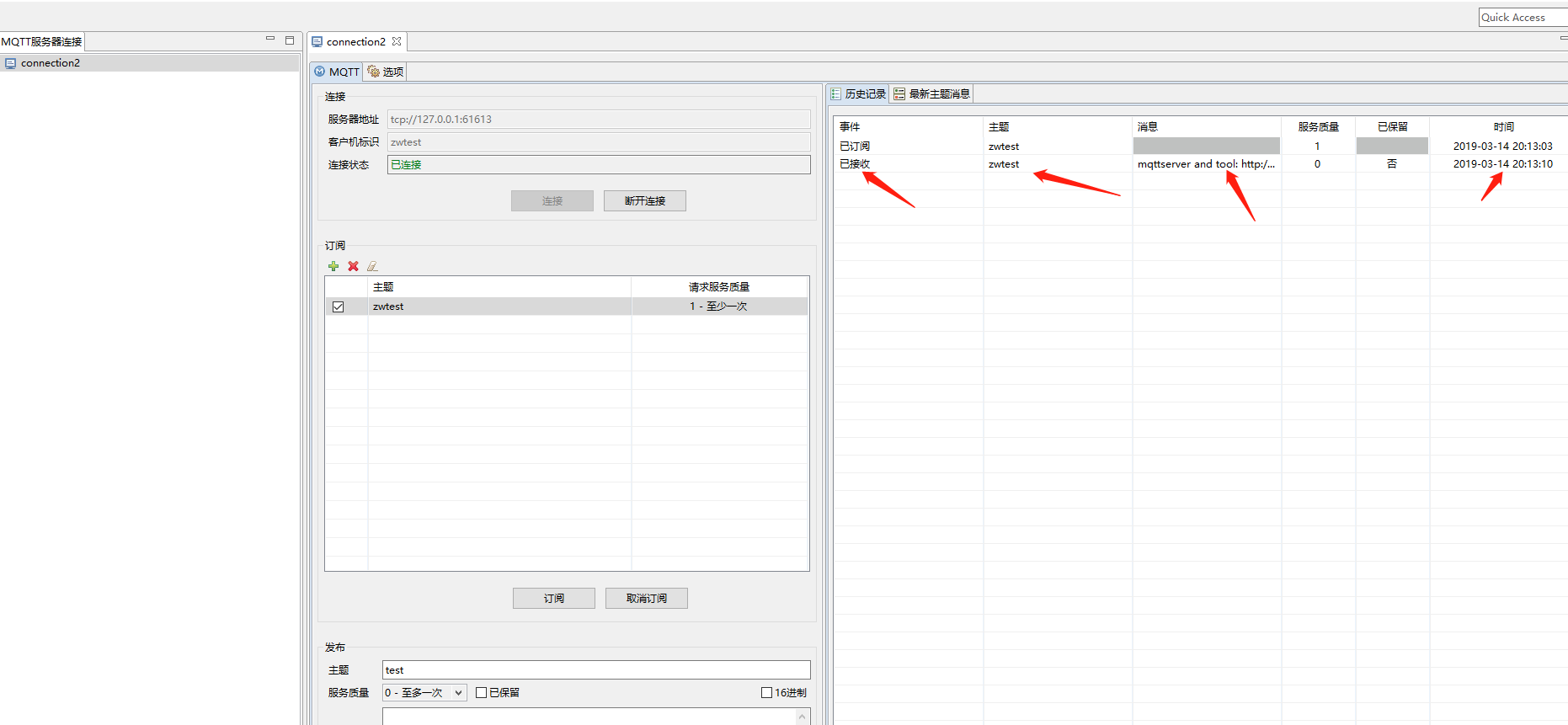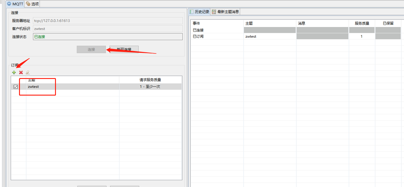 这里输入相关信息后,勾选启用,就可以看到是否连接上了,下面的圈圈绿了,旁边也会有日志。这里订阅一个主题。