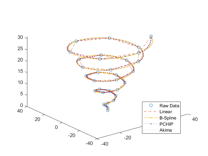 列举四种方法,分别为:分段线性插值、三次样条曲线(B-Spline)插值、三次 Hermite 插值(PCHIP)、修正 Akima 分段三次 Hermite 插值(Akima)