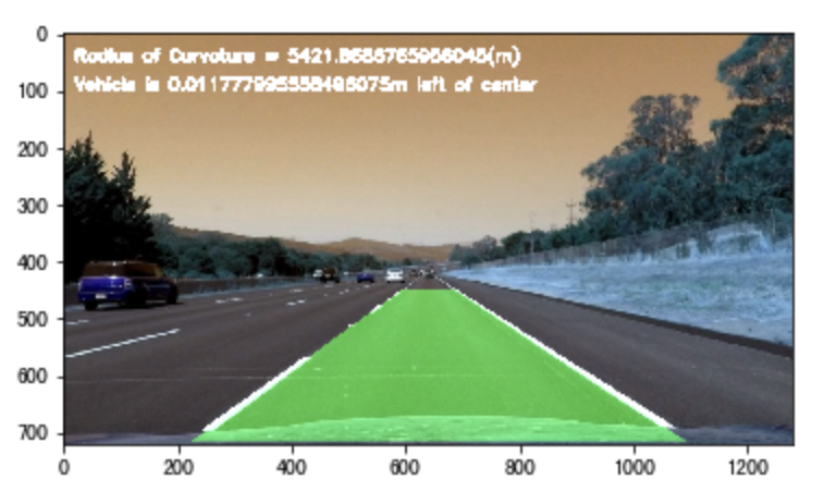 cv2.putText(img, 'Vehicle is {}m left of center'.format(-center_depart), (20, 100), cv2.FONT_ITALIC, 1,