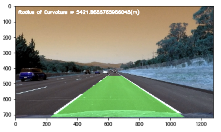 cv2.putText(img, 'Radius of Curvature = {}(m)'.format(np.mean(left_curverad)), (20, 50), cv2.FONT_ITALIC, 1,