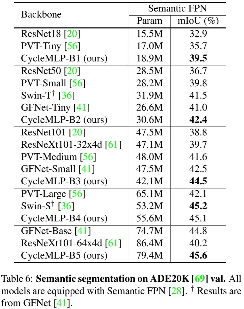 上表对比了CycleMLP在ADE20K语义分割任务上的性能对比,从中可以看到: