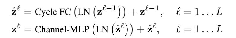 上图b给出了本文所提CycleFC模块示意图,相比已有MLP-Mixer(见上图a),主要区别在于:所提Cycle Fully-Connected Layer(CycleFC)用于进行空域投影并促进模型进行上下文聚合与信息通道。具体来说,CycleFC模块包含三个并行CycleFC操作后接一个channel-MLP。公式描述如下: