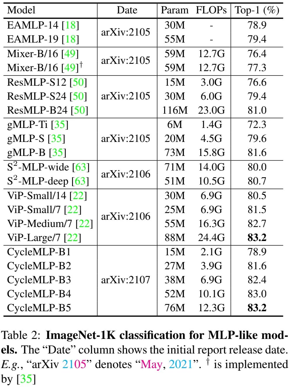 上表对比所提CycleMLP与其他MLP架构在ImageNet数据集上的性能对比,从中可以看到: