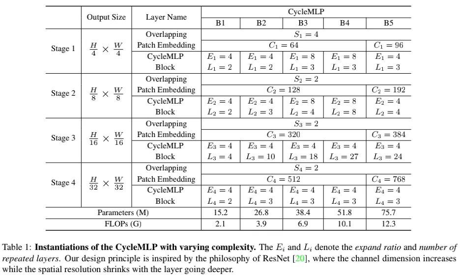 类似其他Transformer、MLP模型,我们定义了不同计算量的模型,从2.1G到12.3GFLOPs。我们定义三路并行CycleFC的伪核尺寸分别为 。通过调整一下超参得到了CycleMLP-B1到CycleMLP-B5等模型: