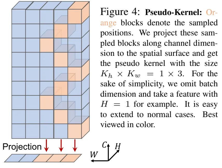 Pseudo-kernel 在这里,我们将引入pseudo-kernel(伪核)概念,见上图。我们将CycleFC的采样点(即橙色块)投影到空域平面并定位投影区域为伪核尺寸。假设输入特征为