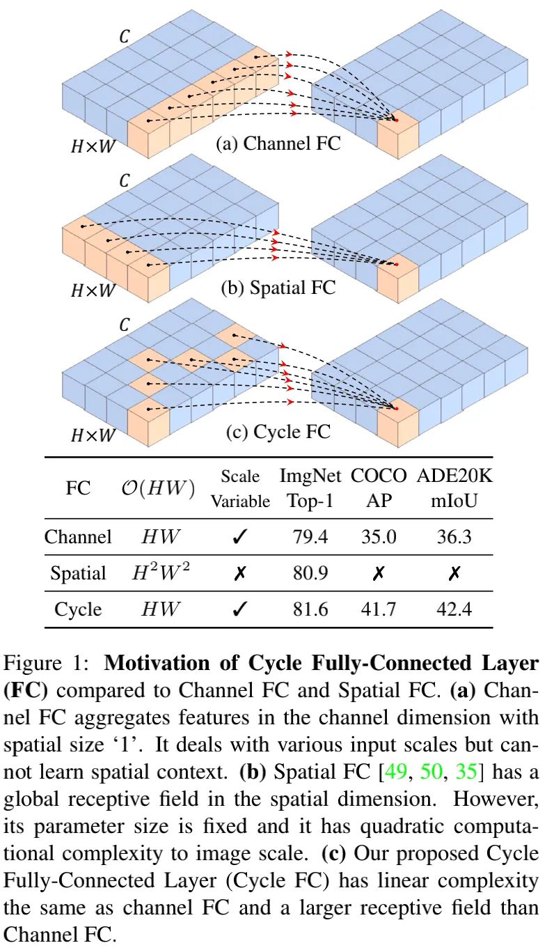 提出了一种新的MLP模块:CycleFC,它是一个广义的即插即用操作,可用于替换MLP-Mixer中的token mixing MLP操作;此外,CycleFC计算复杂度与图像分辨率成线性关系;