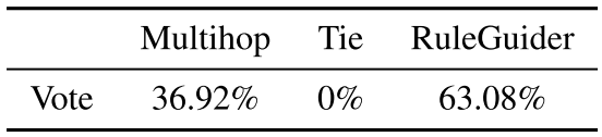 表4:Multihop(Lin等人,2018)和ruleGuider之间的人为评估投票,以正确预测FB15K-237开发集上的路径。 两种模型都使用ComplEx奖励整形。