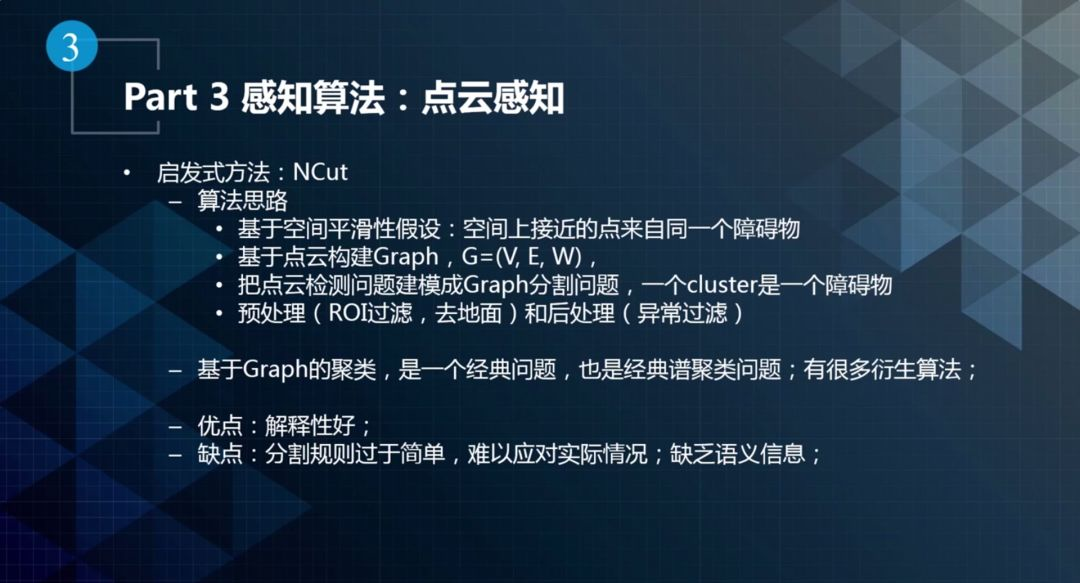 Ncut算法的基本思想是基于空间平滑性假设,即空间上接近的点来自同一个障碍物。首先,利用地图信息对点云进行预处理,例如去掉感兴趣区域之外的点云,降低点云图的复杂度。然后根据预处理后的点云构建加权图G=(V, E, W),将点云分割转换为图分割的问题,可以利用图聚类的算法求解,最终求解的每一个cluster就代表一个障碍物。该算法的优点是解释性好,缺点是分割规则过于简单,难以应对实际情况(草丛、绿化带),主要原因在于缺乏语义信息。