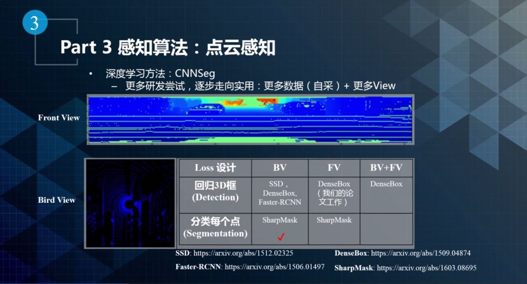 主要思想是利用卷积神经网络来处理激光雷达捕获的点云数据,并对点云中的目标进行识别。深度学习是数据驱动的,它把人工构造特征这一任务交给机器和算法去完成(即特征学习)。在百度的深度学习感知实现过程中,团队尝试了很多方法,下面就简单介绍算法研发的历程。