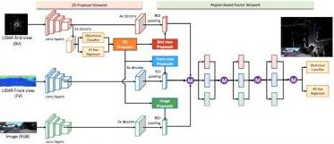 3、因为俯视图没有高度信息,因此我们把前视图和Camara图像加进来进行辅助检查,利用Lidar的测距准和Camera识别准优势完成了Middle-Level Fusion方法(Multi-View 3D Object Detection Network for Autonomous Driving),发表在CVPR 2017。该方法使用俯视图提取Proposal,利用前视图和光学图像辅助进行更加精准的位置回归。其流程如下图所示。