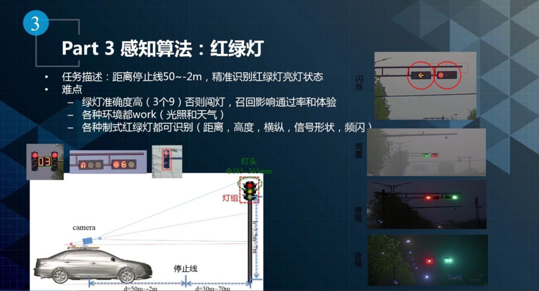 红绿灯感知的任务是在距离停止线50~-2米的范围内精准识别红绿灯亮灯状态。它的难点在于检测精度要求非常高,必须达到三个九(99.9%),否则会出现闯红灯,违法交规的情况。另外召回也不能太低,假设一直是绿灯,但是一秒只召回一帧绿灯,其他都认为是识别错的红灯,则通不过路口,影响通过率和体验。第二是红绿灯感知需要应对各种环境,包括天气和光照。最后是红绿灯的制式非常多,包括距离、高度、横纵、信号状态等,红绿灯感知都需要识别。