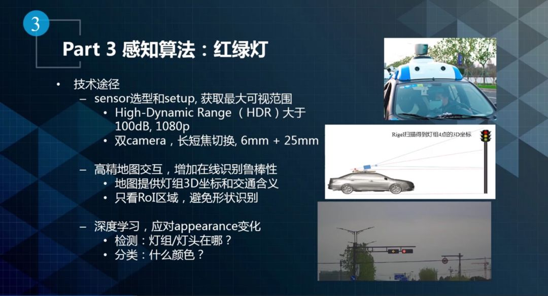 红绿灯感知是百度无人车第一个使用深度学习、使用Camera的模块。在当时使用深度学习、GPU和Camera做红绿灯感知是存在很多争议的,但是我们一直坚持走这种探索性的道路,并且成功了。现在车上用深度学习、GPU、Camera进行感知已经是一种共识。