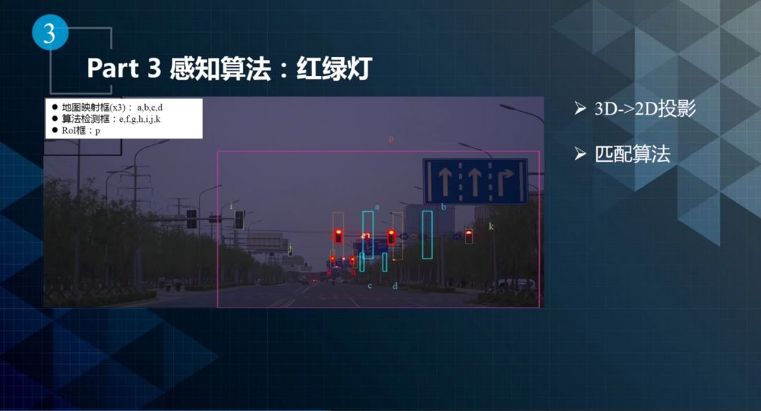 实际使用过程中可能会更复杂。如上图所示,一条道路上有很多红绿灯,检测算法会把所有的灯都检测出来,地图会告知需要看几个灯,但是并不知道看哪几个灯。因此需要把对应关系匹配起来,需要做3D到2D的投影,投影又受到标定、定位、同步、地图等因素的影响,需要综合考虑才能解决好这个问题。