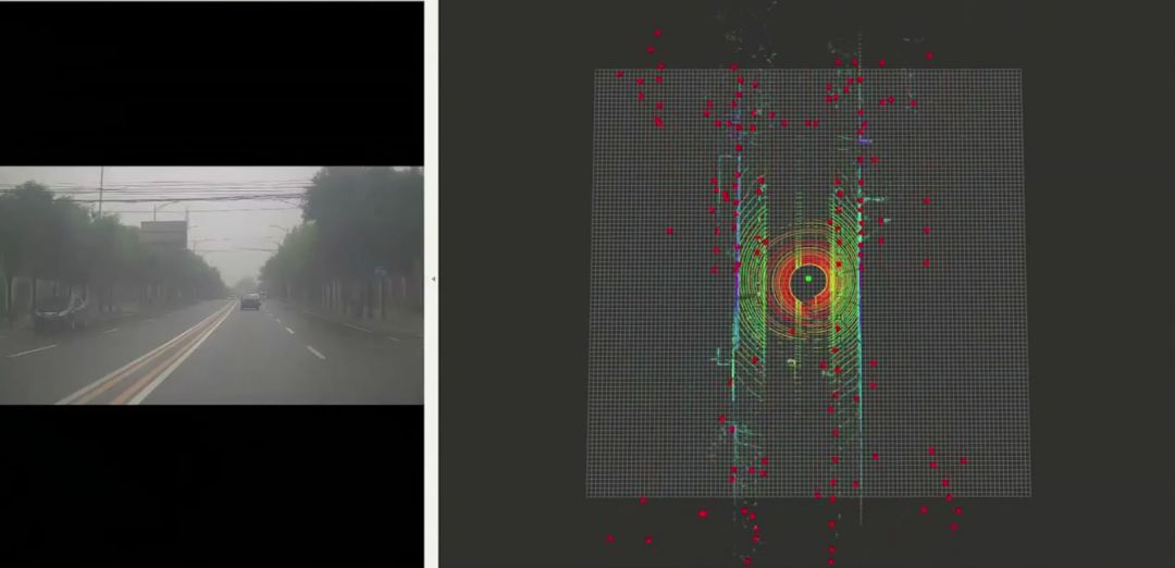 上图右边是Radar的点云信号投影的成像。图中有很多的点,但是并不是所有的点都是障碍物,存在很大的噪音,需要进行鉴别。图中明显成一条线的点是对路边界金属栅栏的感知结果。因为金属的反射信号比较好,所以雷达点会成直线分布。基于该特征,可以用Radar反射信号来做高速路道路边缘栅栏的检测。