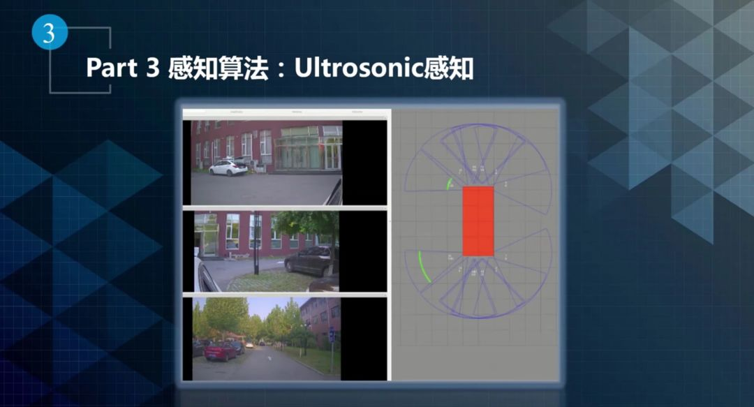 超声波只能进行近距离感知,并且无法感知具体的位置。对无人驾驶来说,行驶过程中帮助并不大,更多的是用于倒车和特别近距离的感知。上图给出了超声波感知的一个例子,我们在车上布了12个超声波传感器,每个超声波探头覆盖一个角度,大概检测到三米范围内的障碍物。当某个地方有障碍物,传感器发送超声波,收到回波信号以后可以得到障碍物的距离信息,但是并不能确定在覆盖范围内哪个地方有障碍物,如图中的绿线。如果两个探头感知范围存在over lap,这两个传感器的两根绿线会交接,就可以确定障碍物的准确位置。