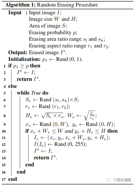 这个方法有点类似于Cutout,这两者同一年发表的。与Cutout不同的是,Random Erasing掩码区域的长宽,以及区域中像素值的替代值都是随机的,Cutout是固定使用正方形,替代值都使用同一个。