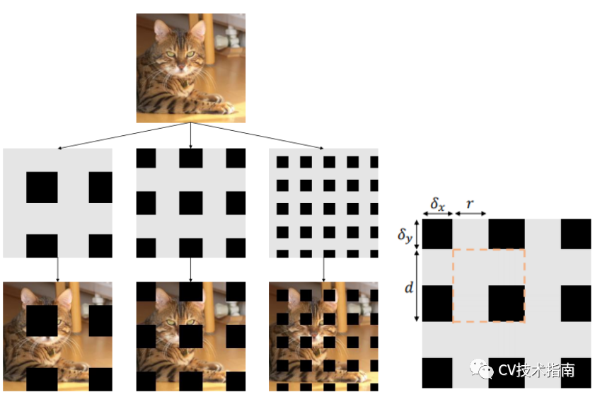 主要思想是对前几种方法的改进,由于前几种对于掩码区域的选择都是随机的,因此容易出现对重要部位全掩盖的情况。而GridMask则最多出现部分掩盖,且几乎一定会出现部分掩盖。使用的方式是排列的正方形区域来进行掩码。