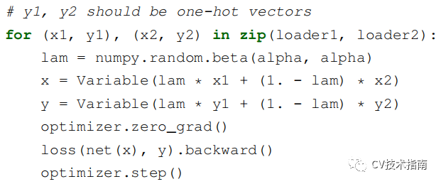 主要思想是将在数据集中随机选择两张图片按照一定比例融合,包括标签值。在论文中给出了代码,看一眼代码即可很好的理解。