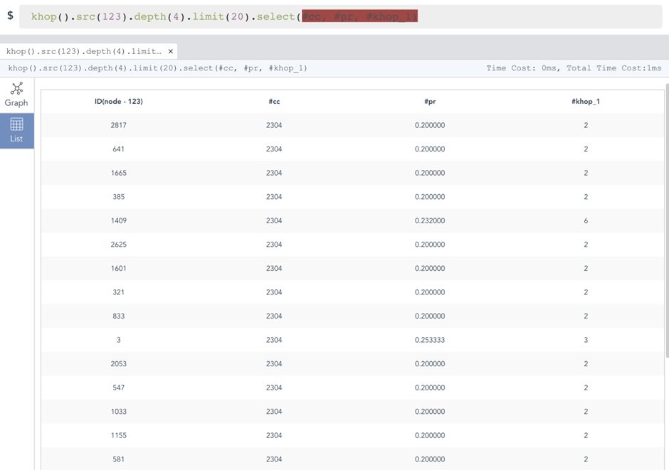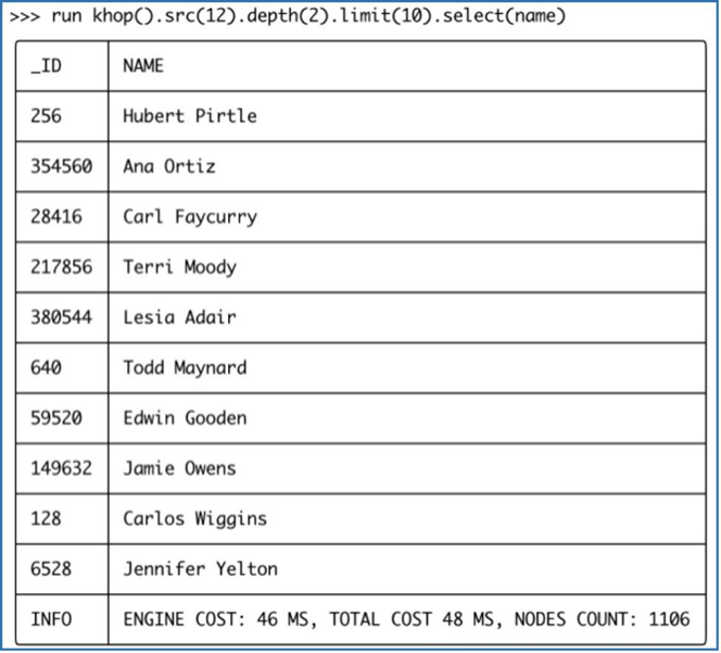 在上图中,khop( )操作返回的是从初始顶点出发经过depth( ) 限定的深度搜索后返回的第K层的邻居的集合,使用select( )可选定需要具体返回的属性。