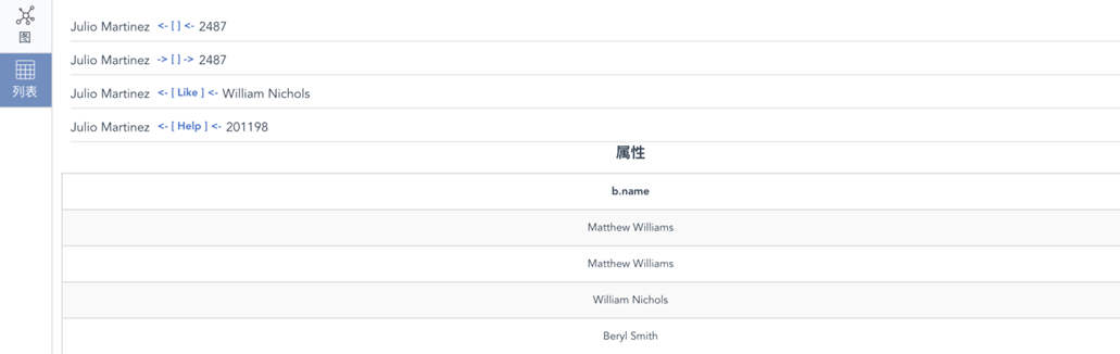 和传统SQL类似的地方是可以对任何过滤条件设置别名,不同之处在于当异构结果a和b.name一同被返回的时候,a表达的是整个模板搜索所对应的路径结果的集合,而b.name则是一组顶点的属性的数组集合,如下面两张图所示,这种异构灵活性是SQL不具备的。