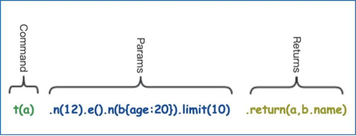 t(a1).n(n1{age:20}).e(e1{rank:{$bt:[20,30]}})[3:7].n(n2).limit(50).return(a1, n1, e1, n2._id, n2.name)