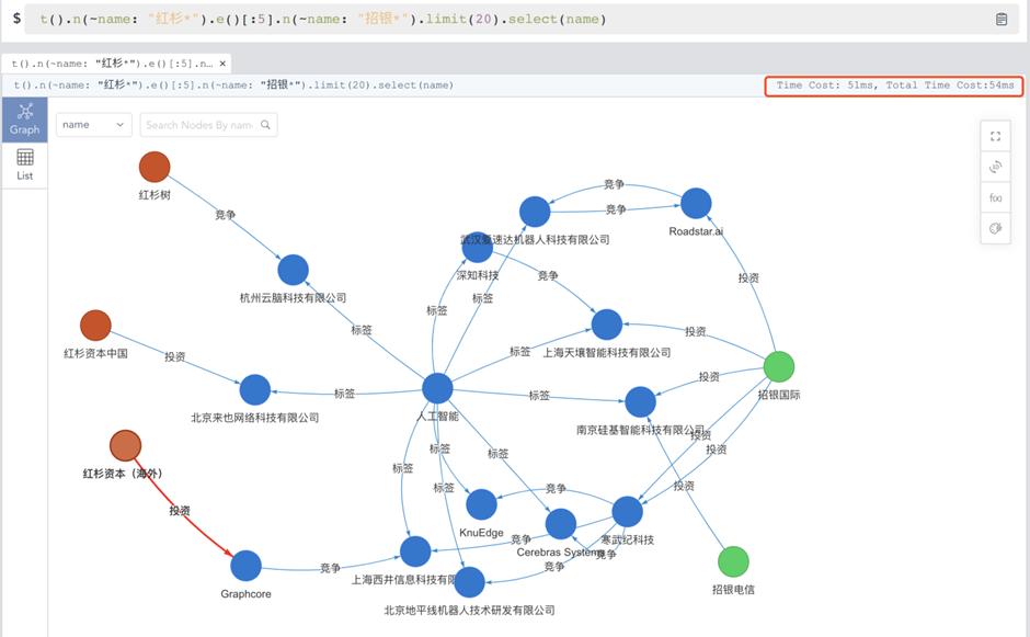 假设我们在一个工商数据集之上,在天眼查、企查查做类似的查询,你要先找到名字中包含有“红杉”或“招银”字样的公司,然后再分别对每一家公司的投资关系进行梳理,需要查清楚每家被投公司的合作、竞争、董监高等关系,然后再慢慢梳理出来是否能在5步之内关联上名称中包含“红杉”字样的一家公司和包含“招银”字样的另一家公司。这个操作绝对是让人疯狂的,你可能需要花费数天的时间来完成,或者能够通过写代码调用API的方式来“智能化”的实现。无论如何,你很难在下面两件事情上击败Ultipa GQL: