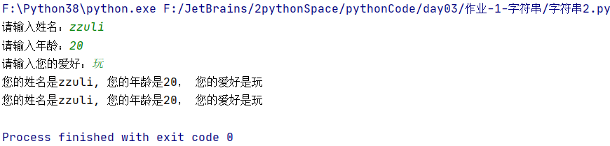 print("您的姓名是%s, 您的年龄是%s, 您的爱好是%s" % (name, age, hobby))