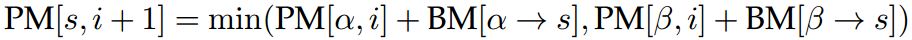 假设接收机已经在时刻i计算好每个状态s的路径量度PM[s,i](设卷积码的编码约束度为K,则状态数为2^(K-1))。在硬判决译码中,PM[s,i]的值是在接收监督比特与最可能发送的消息进行比较时得到的差错比特总数(通常我们将状态“00”作为起始状态)。