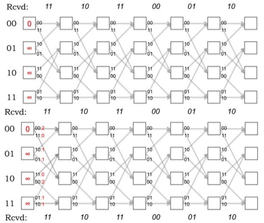现在我们可以来描述译码器是如何找到最大似然路径了。初始时,状态00代价为0,其它2^(k-1)-1个状态代价为正无穷(∞)。