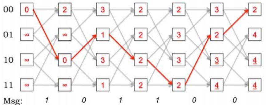 在时刻i的所有可能状态中,最可能的状态是具有最小路径度量的状态。如果具备最小路径度量的状态不止一个,那它们拥有相等的可能性。